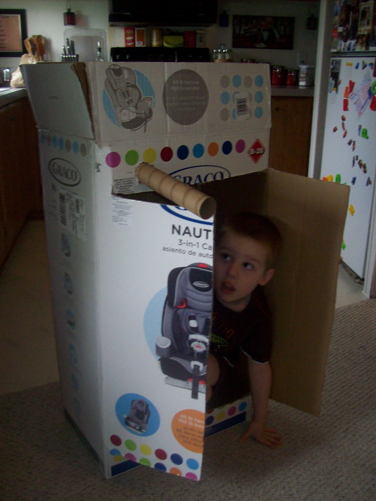 Not only did Isaiah benefit from this gift, but so did his big brothers. Jeremy cut some doors in the box and I added a hole for apaper towel roll spy lookout device and Nathan and Jordan now have themselves I hideout.
